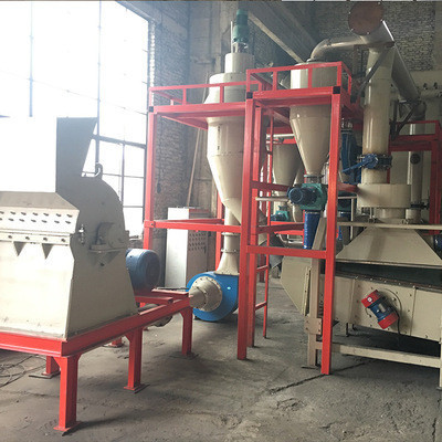 電路板回收設備 生產線主要由輸送機、一ji破碎機、二級破碎機、磁選機、粉碎機、高壓靜電分選設備和其它輔助設備組成。廢線路板經人工拆裝后,將有害電器部件如電池、變壓器及可再用零件拆下,剩余部分由刮板輸送機送至一ji破碎機,破碎物料20 mm以下,再送至二級破碎機,破碎物料5 mm以下,磁選機將含鐵物料分離,剩余
